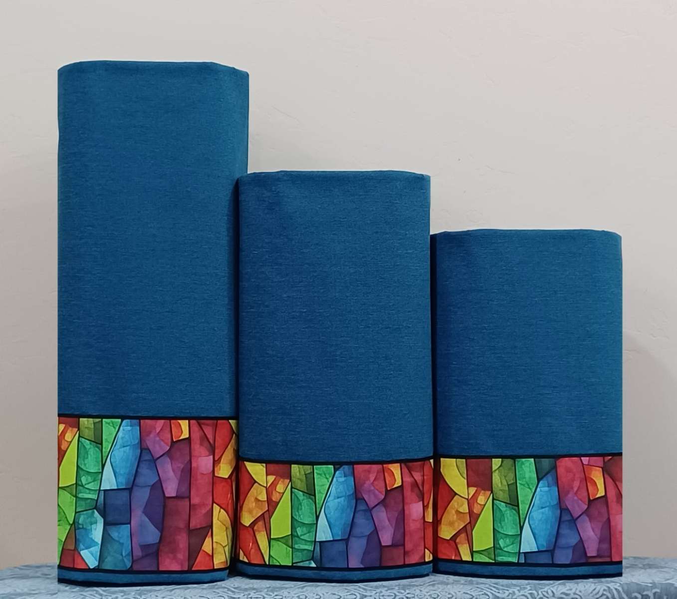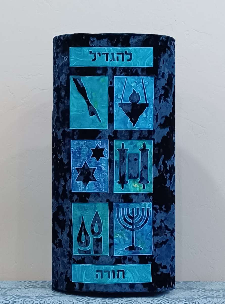 Most often, “everyday” torah mantles or covers are made in colors that compliment a sanctuary’s interior. My original designs are made from durable, yet beautiful fabrics. Fabrics may include chenille, silk, hand dyed cottons, lame, Ultrasuede, and more. There are many ways to embellish torah covers, including the use of applique, embroidery, beading and quilting techniques, as well as intricate piecework. The fabrics used will enhance the specific designs chosen.
